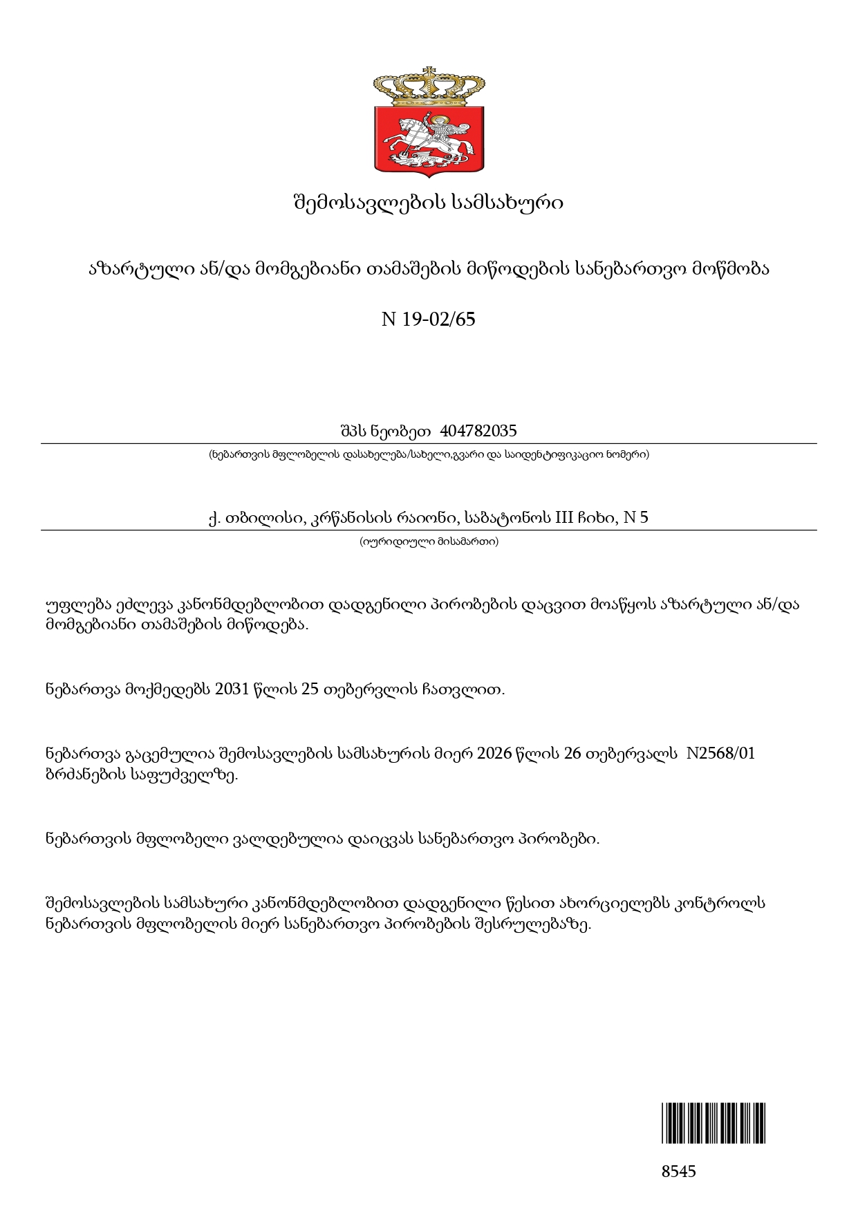 Revenue Service License Certificate